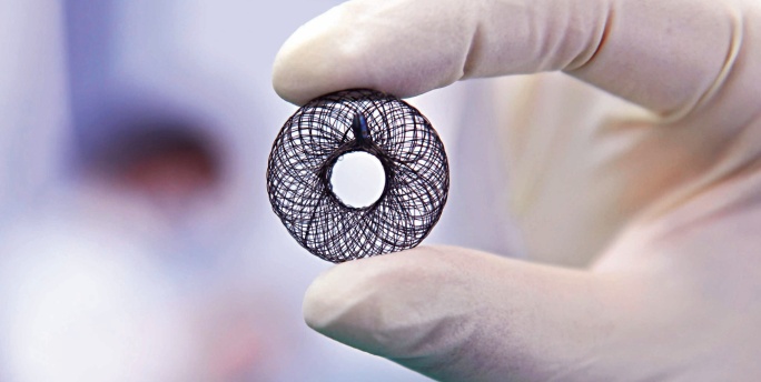 在武汉唯柯医疗科技有限公司,一个熟练工制作一枚直径约24mm的心房分流器要用近三个小时,再经过高温定型等多道工序完成。心房分流器用于心力衰竭的治疗上,是国内首创、国际领先的心衰介入治疗前沿器械。 长江日报记者高勇 摄
